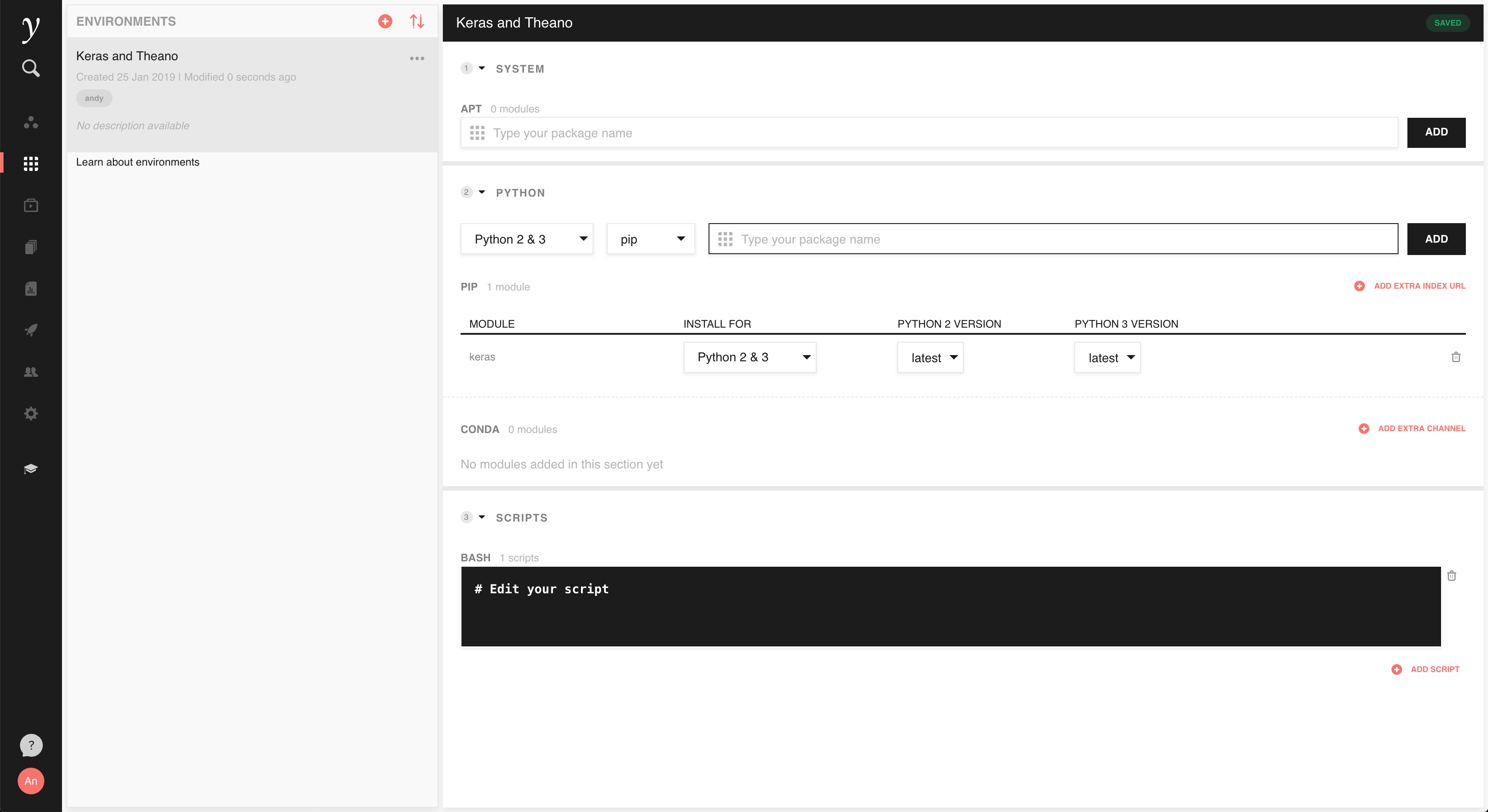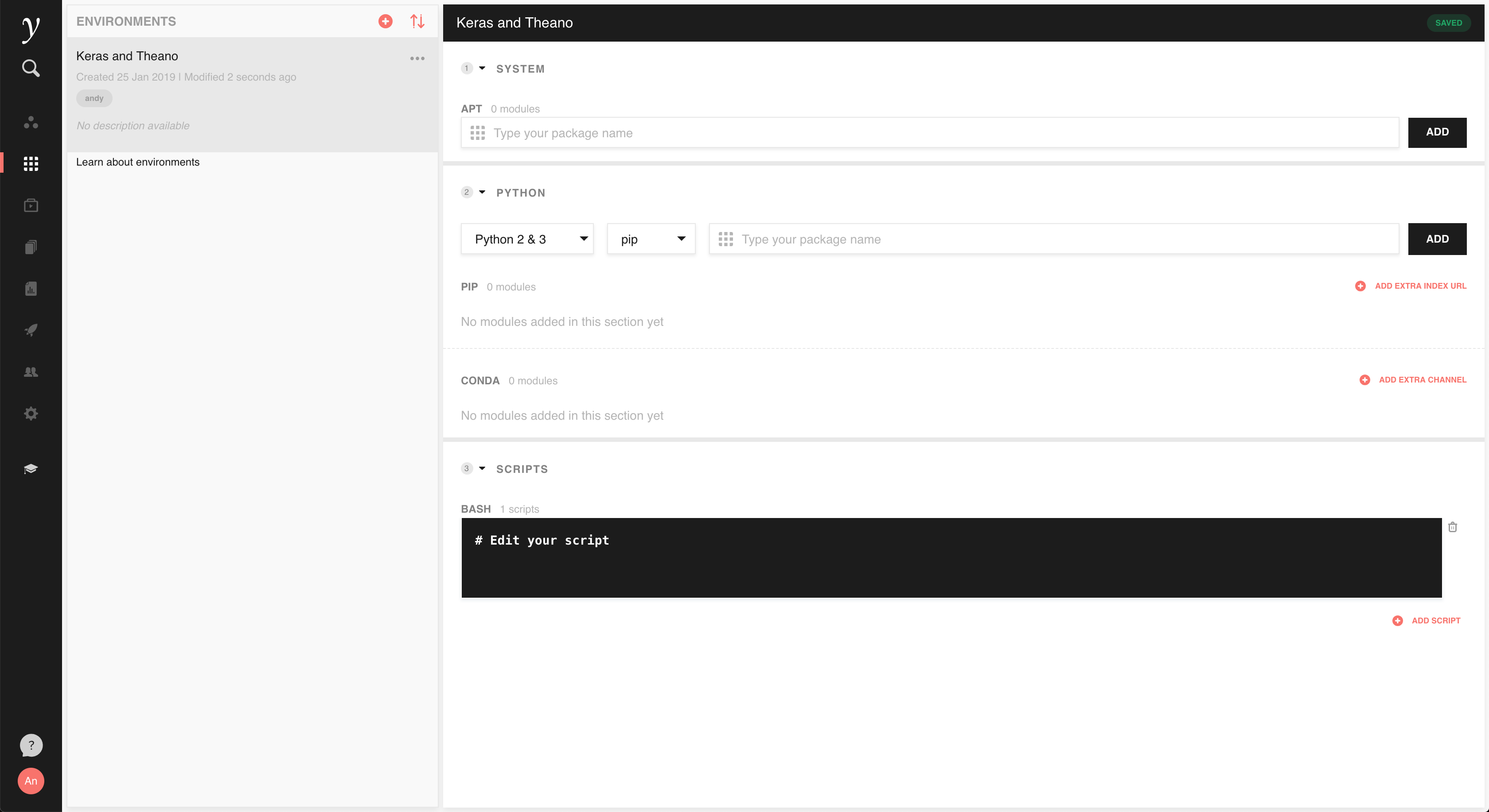 Let’s walk through the example of creating a custom server environment to install the Theano and Keras machine learning libraries. To create a custom environment, go to the Environments tab and click to add your first environment.