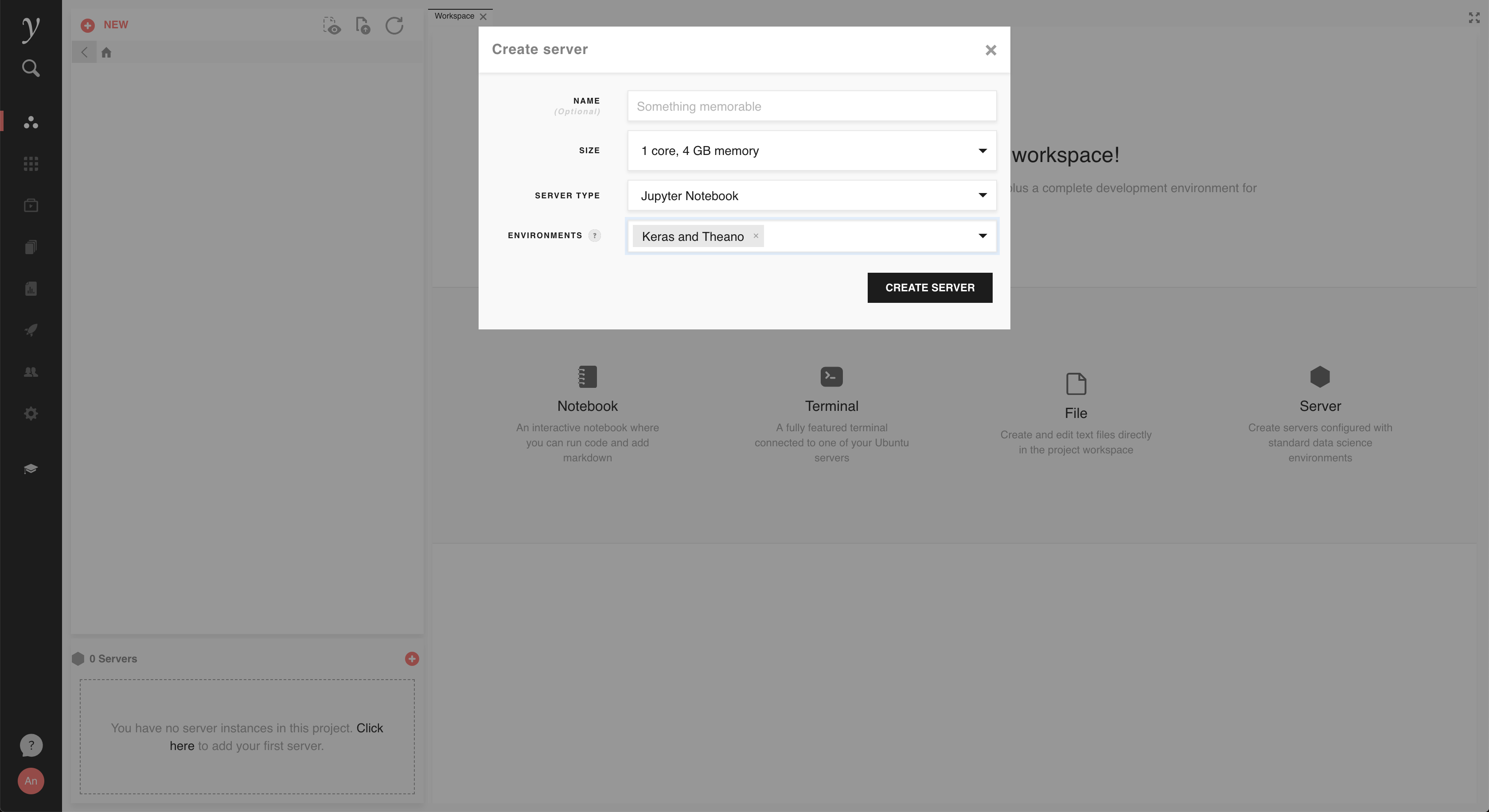 We can now use our new custom environment when creating a new server. Navigate to the Workspace tab and click NEW and then Server. In the modal that appears, choose the environment we just created from the ENVIRONMENT dropdown menu.