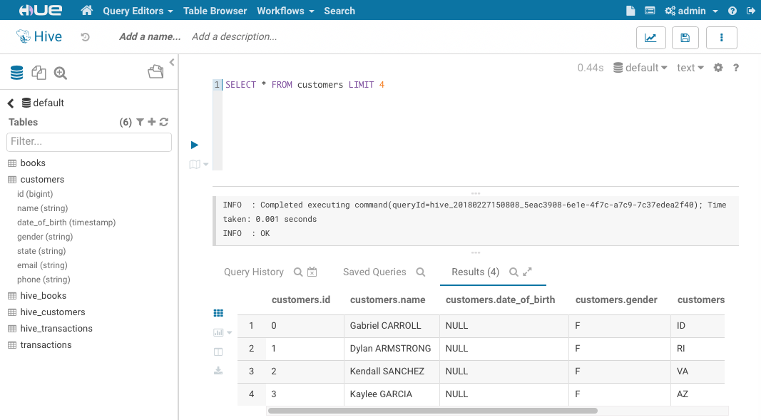 Get the web address and login credentials from your Hadoop cluster administrator, and open the Hive Query Editor to start exploring tables and testing queries: