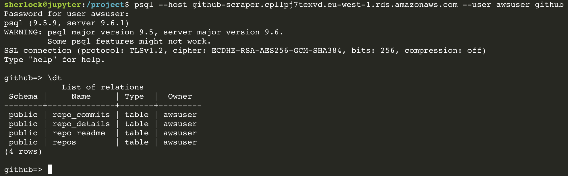 github-scraper.cpllpj7texvd.eu-west-1.rds.amazonaws.com with username