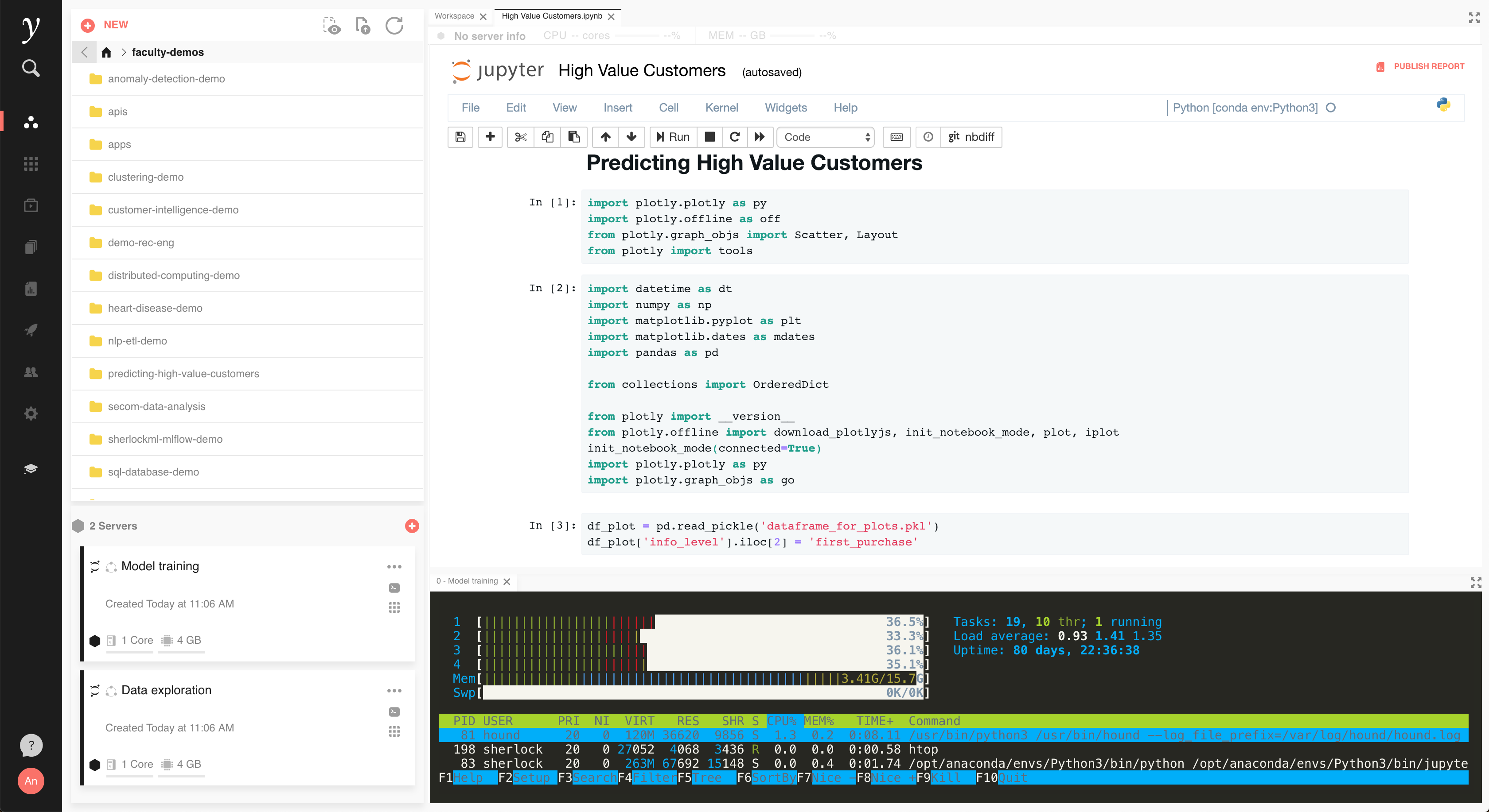 Faculty allows you to share data and code securely with team members, publish version-controlled reports of your analysis and access the Jupyter environment at the touch of a button. Features like unlimited file-size upload, automated data exploration and scalable computing power mean less time accessing and cleaning data and more time building models. Nevertheless, when you need it you can open a terminal for unrestricted access to your servers.