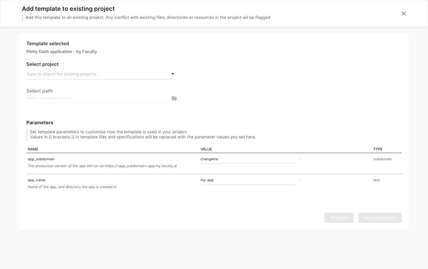 Choose the project you wish to apply the project to, and select where in that project’s workspace any files are to be placed. By default, files will be placed in the root of the workspace. If a directory is entered that does not yet exist, it will be created on application of the template. Below, you are also able to enter values for the template’s parameters.