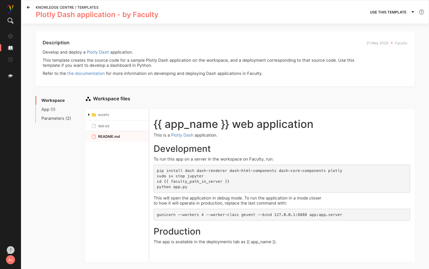 For example, we can see that the Plotly Dash demo will create some files in the workspace and one Faculty app, which runs the demo:
