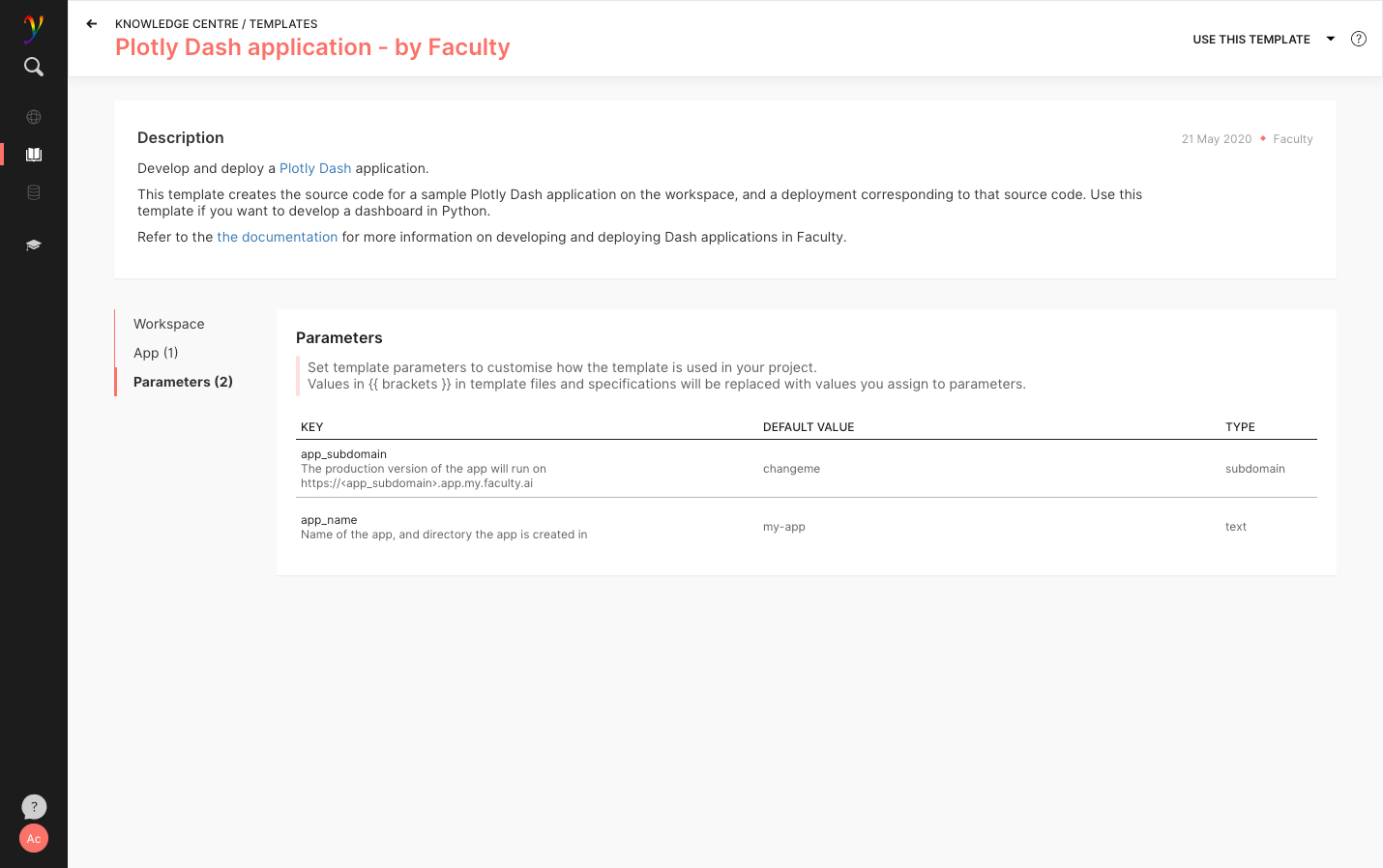 Navigating the the “Parameters” section, we can see that this template allows us to customise the name and subdomain of the app that will be created: